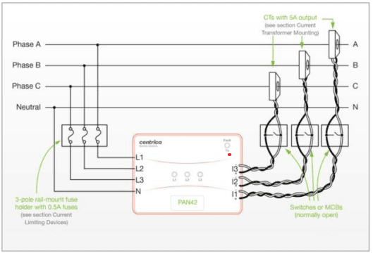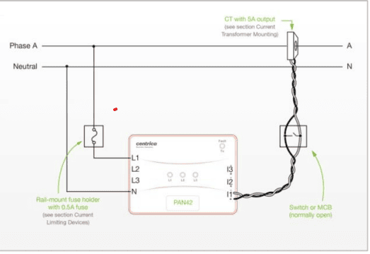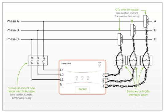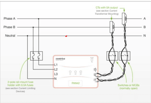 As shown in the ‘Electrical connections’ section above, the CTs should be connected to PAN-42 through normally-open shorting switches or MCBs. Before mounting any CT on an active hot wire, its switch/MCB should be switched to the closed position, so that the CT’s output is shorted. After the PAN-42 sensor’s current input is connected, the switch can be moved to the open position.