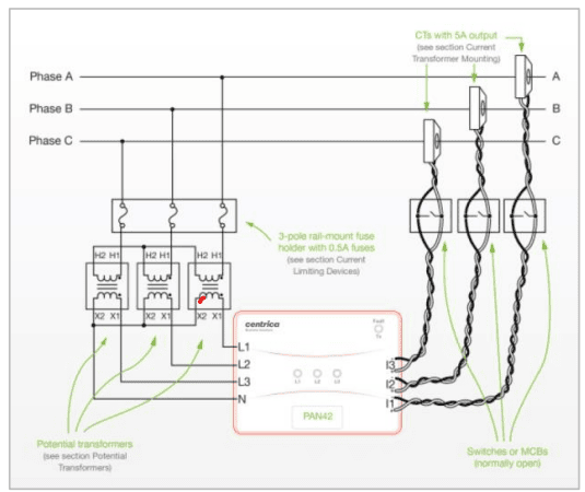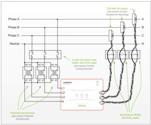 6. When connecting to mains voltage >277VAC phase-neutral, or when installing in a noisy industrial environment, a potential transformer is required. See the ‘Potential transformers’ section for more details.